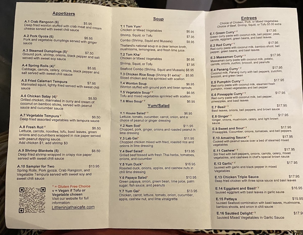 Customer reviews speak volumes about the amazing service provided by the staff, with a notable mention of their hospitable host, Noi. Diners rave about well-balanced portions that focus on quality ingredients rather than quantity. Signature dishes include mouth-watering mango with sticky rice and delicious salads that leave you craving more. Whether you're opting for lunch specials or indulging in festive dinner options, each experience at Little Ninja promises to delight your palate.